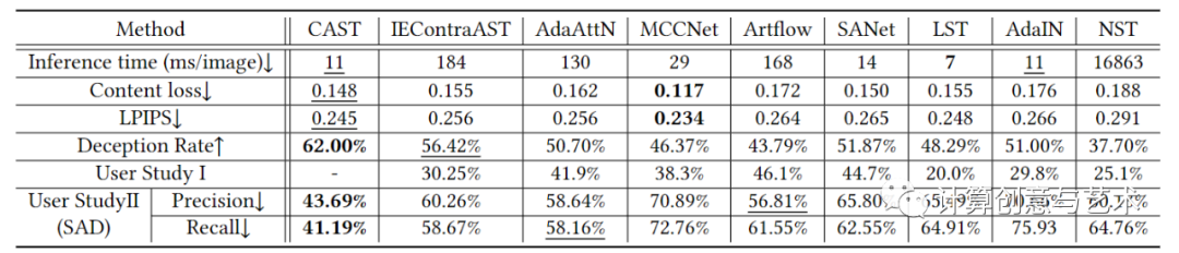 此外,我们与主流的任意图像风格化方法进行了系统的定量分析,并设计了两个用户参与的调查问卷。结果表明,CAST取得的结果在推理速度、内容及风格保持等方面均取得了很好的结果。特别的,用户调查问卷表明,CAST是目前唯一一个可以在真实/合成画作挑选任务中迷惑用户的方法。更多实验结果见论文原文。