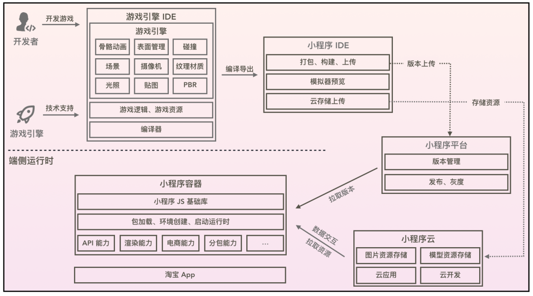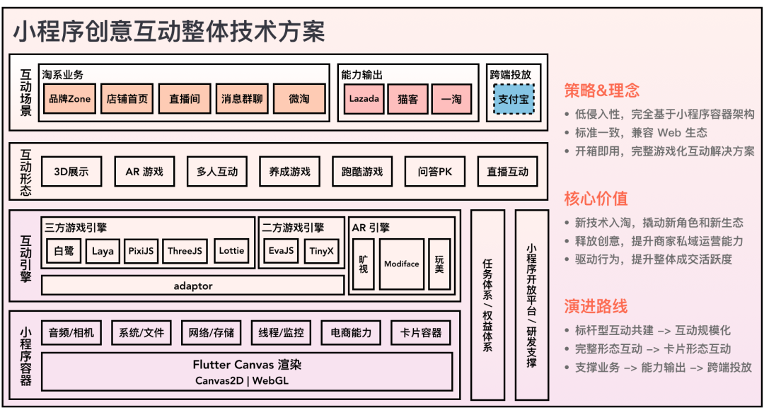 阿里妹导读:小程序创意互动项目,作为淘宝购物小程序全面提升消费体验和满足商家个性化运营的重点项目之一,从 2020 年 3 月底正式 KO 到今年双11,已经经历了多次迭代。在购物小程序技术、产品、运营团队同学的通力合作和共同努力下,初步实现了容器渲染层的替换、游戏引擎的谈判接入、多个引擎 IDE 的联动打通。小程序创意互动服务的旗舰店品牌 Zone、行业 3D 展示等业务也已有序铺开,项目本身的价值和意义开始逐渐展现。本文从一个较为全面的视角对淘宝小程序创意互动项目进行梳理和阶段性小结,介绍相关原理、能力、应用、现状与未来。