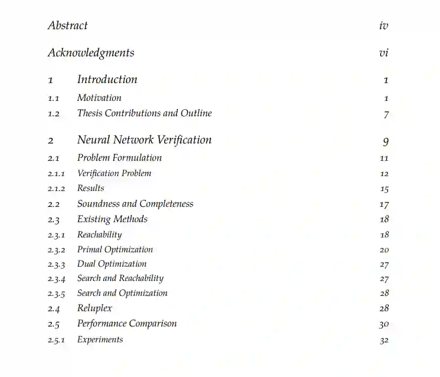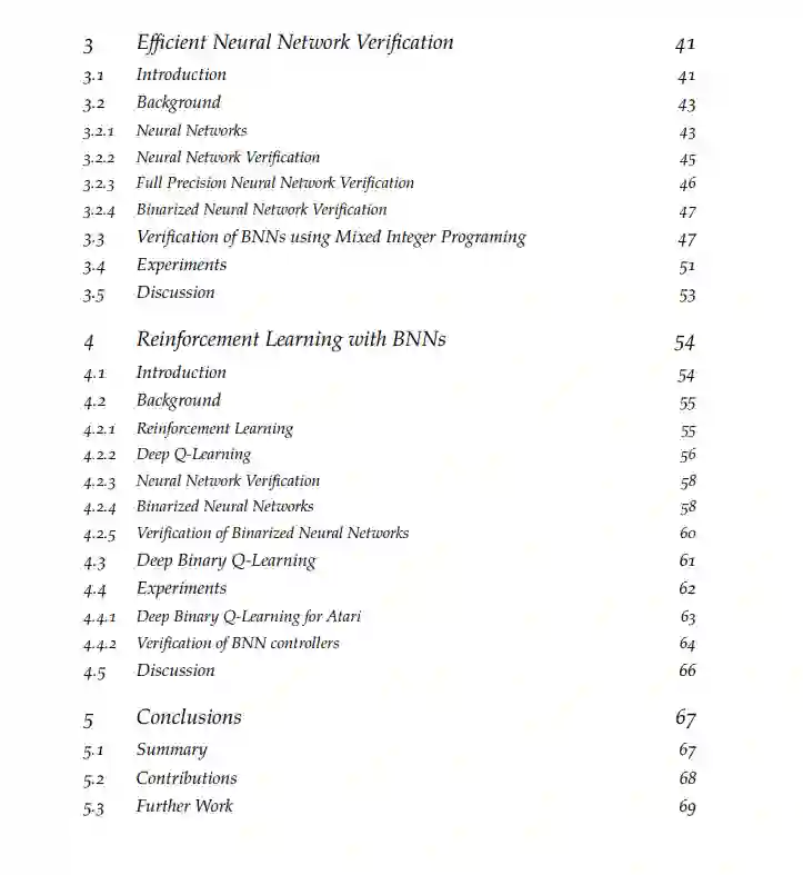 与传统软件不同的是,人类几乎不可能理解神经网络实现的逻辑,这使得它们成为不透明的模型,并可能阻止它们在安全或关键任务应用中使用。在很多情况下,仅仅运行模拟还不足以让人们对它们建立信心,因为一个故障就可能导致灾难性的后果。本文的工作解决了在具有神经网络组件的机器学习系统中建立信任的挑战。我们首先介绍神经网络验证,这是一种验证网络是否具有所需属性的过程。我们介绍了神经网络验证的最新进展,包括我们自己的贡献,并表明,尽管取得了进展,验证仍然是一个非常具有挑战性的问题,目前的算法难以扩展到大型网络。然后,我们提出了一种可选的方法,该方法将验证需求合并到模型的设计中。更简单的模型更容易验证,我们证明了一些问题可以用二值化神经网络(BNNs)解决,明显更简单的模型,参数可以用1位表示,具有与全精度模型相似的性能。我们提出并演示了一种简单的混合整数规划方法来验证它们,并表明该方法具有良好的可扩展性。最后,我们提出了一种深度强化学习算法,类似于使用BNN作为函数逼近器的深度Q学习算法。我们再次表明,这种方法能够牺牲少量性能,并获得可扩展的验证。