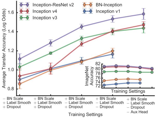 如上,左图是直接把网络倒数第二层特征直接拿出来进行迁移学习(使用Logistic Regression),右图是在新应用上find-tuned的迁移学习表现。可以注意到,只要是模型本来表现就好(横左标),迁移的效果就更好(纵坐标)。从性能最差的MobileNet到性能最好的Inception-ResNet无一例外。
