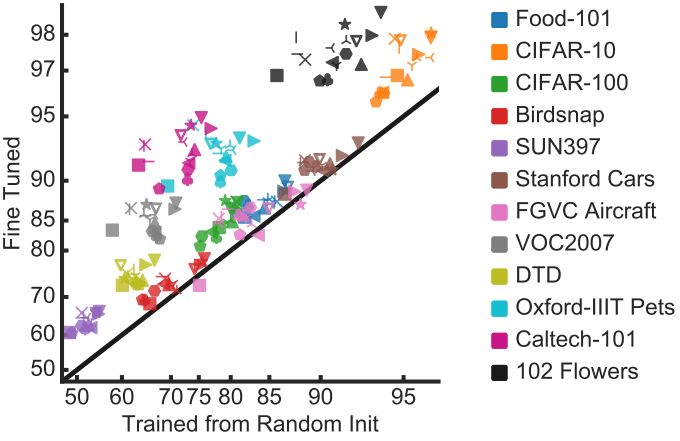 文章指出,对于find-grained分类数据集(大类中含小类,小类中还能分类),如果数据量小的话,迁移学习确实有用,而如果数据量非常大,从头开始训练和迁移学习最后的效果差别不大。如上图,每个点是模型在一个数据集上迁移学习和从头训练的准确率。