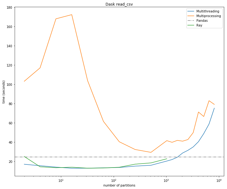 如上图所示,由于串行化和拷贝操作,Dask 的多进程模式损伤了 read_csv 操作的性能。
