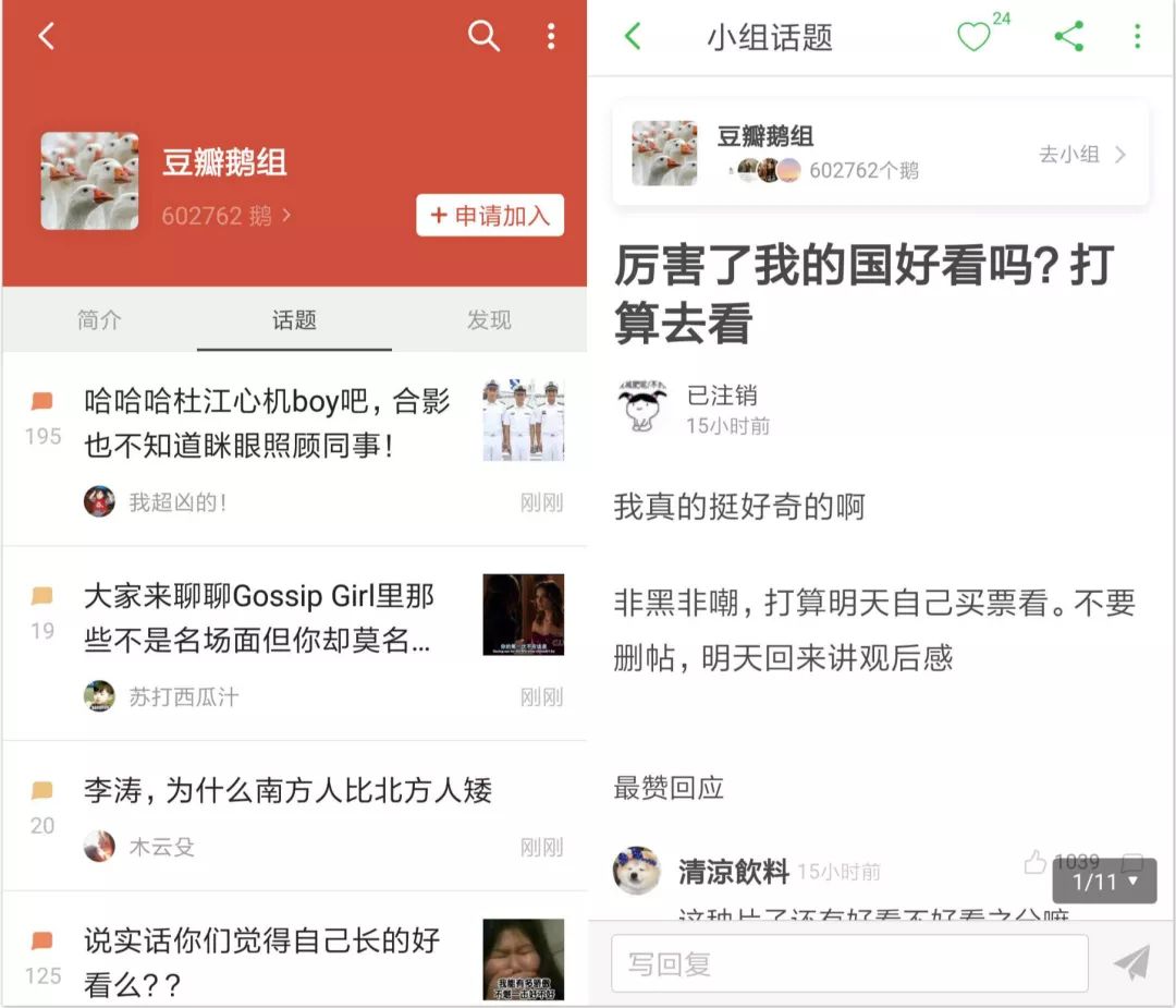 早期豆瓣比较大的小组,如“父母皆祸害”、“假装情侣”等,都是由学生发起。他们的参与感很强,可随着用户年龄渐长,这些小组逐渐没了人气。甚至在同一个组内,很多人也是各玩各的。诸如租房、征稿这些小组,已经变成一个信息工具,其作用和58没有什么两样。