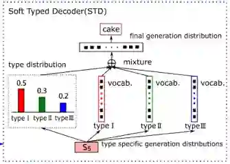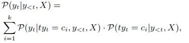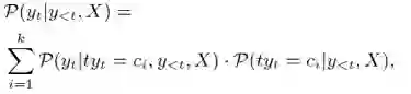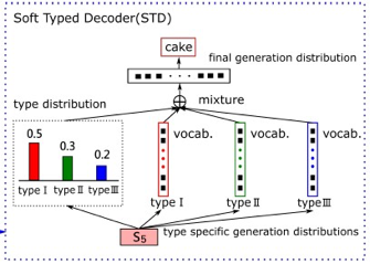即输入编码得到context vector X,再根据已预测序列,可以得到下一个词语type的分布, 然后每个不同的type对应有不同的词语分布,所以将一个词语不同type可能得到的词语分布相加,得到下一个词语的最终分布,如下图所示: