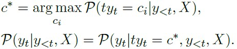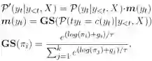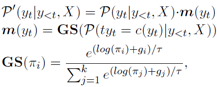 认定下一个词语分布概率最高的作为其类型。因为操作使得反向传播无法进行,文中使用来实现解决该问题,最终下一个词语概率分布如下式所示: