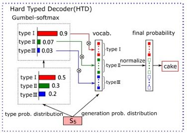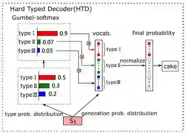 而hard-decoder不同的是,将生成问题的每个词语都强制归属到某一个type,而不是像soft-decoder中,词语的type是一个隐状态,词语可以是所有type中任何一个。这样,在hard-decoder中,下一个词语的概率分布如下式所示: