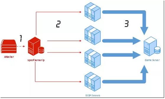 ·由于协议设计缺陷,SSDP服务无法判断请求是否伪造,并向目标服务器进行响应。就这样数量极其庞大的SSDP响应报文同时发往被攻击服务器;