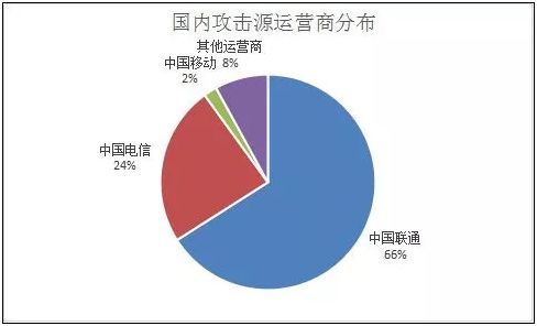 国内攻击源的主要运营商来源为中国电信(占比66%)和中国联通(占比24%)。