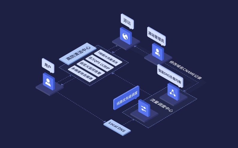 首先来说高防机房,这个大家都知道,最为传统的DDoS防御方案,通过在机房部署DDoS防护设备,对访问服务器的流量进行清洗来实现防御。无论现在市场上的高防机房有什么样的优化与改进,这种方案总摆脱不了几个致命的缺陷