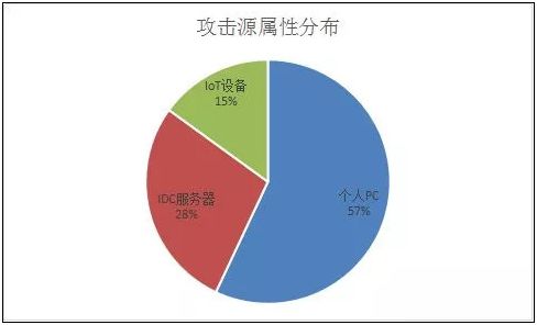 在攻击源属性方面,主要来自于个人PC,占比57%,IDC服务器占比28%,值得注意的是,物联网设备在此次攻击源中占比达到15%。攻击者在攻击武器方面,物联网设备作为攻击源的数量呈明显增长趋势。眼下物联网设备安全问题不容忽视。
