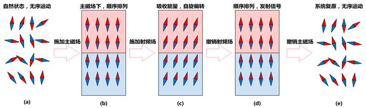 早在20世纪30年代,物理学家伊西多·艾萨克·拉比就发现,在磁场中的原子核会沿磁场方向呈正向或反向有序平行排列(图1(b)),而施加无线电波之后,原子核的自旋方向发生翻转(图1(c))。这是人类关于原子核与磁场以及外加射频场相互作用的最早认识。1946年,物理学家费利克斯·布洛赫和爱德华·米尔斯·珀塞耳发现位于磁场中的原子核受到高频电磁场激发会倾斜。而当高频场关闭后,原子核将释放吸收的能量,并且回归到原始状态(图1(b)至图1(d)过程)。因其在磁共振成像理论基础方面的杰出贡献,伊西多·艾萨克·拉比获1944年诺贝尔物理学奖,费利克斯·布洛赫和爱德华·米尔斯·珀塞耳则分享了1952年诺贝尔物理学奖。