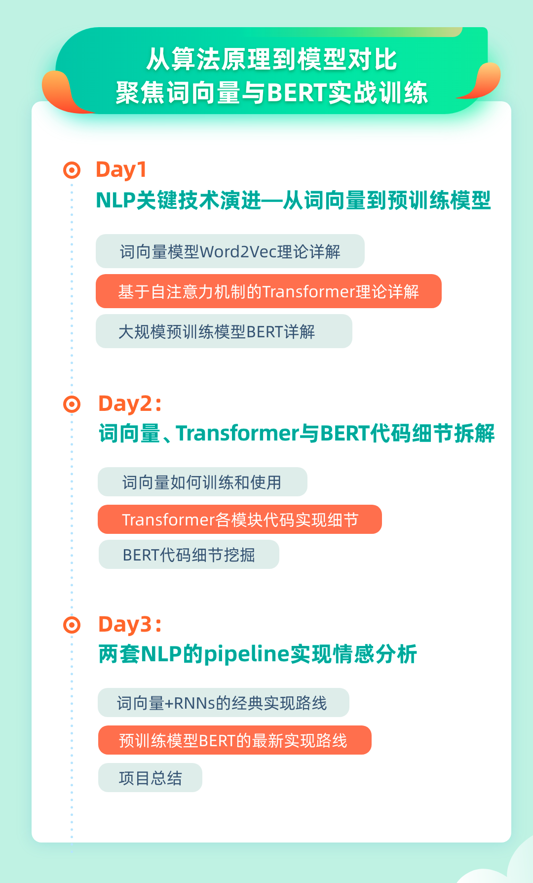 本次训练营为期3天,主要分为三个模块。NLP关键技术演进-从词向量到预训练模型;词向量、Transformer与BERT代码细节拆解;两套NLP的Pipeline实现情感分析。