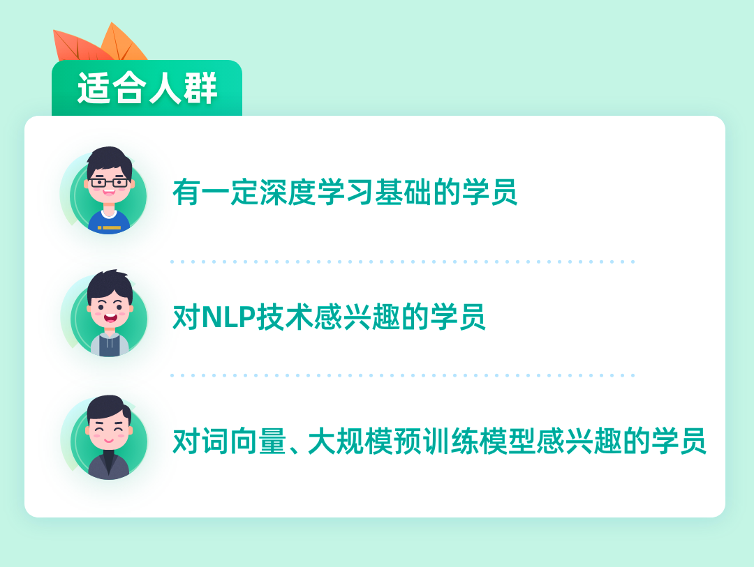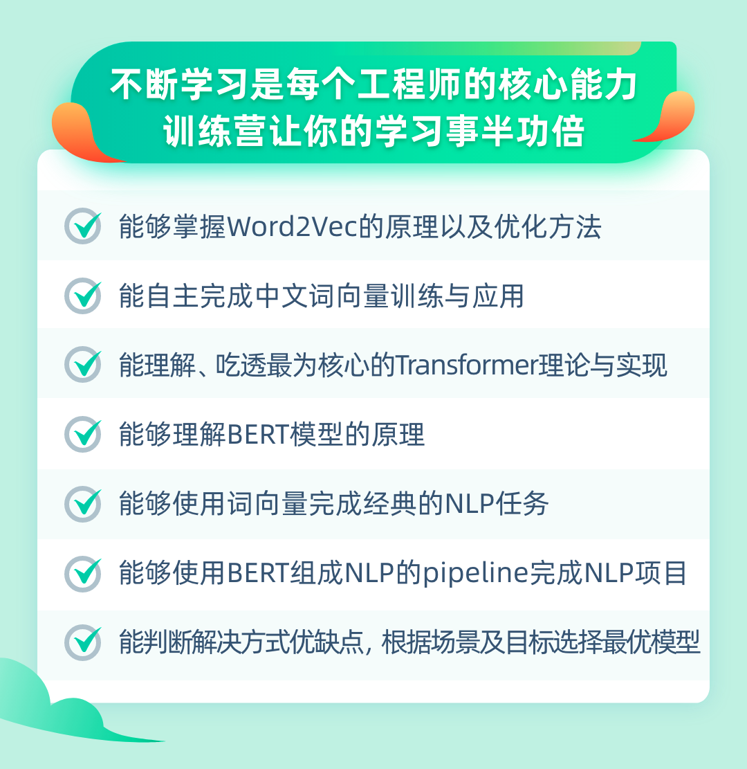 如果你是以上人群,那么这次训练营十分适合你。从原理到实操掌握词向量&BERT,让你业务实战能力up!快速实现升职加薪!