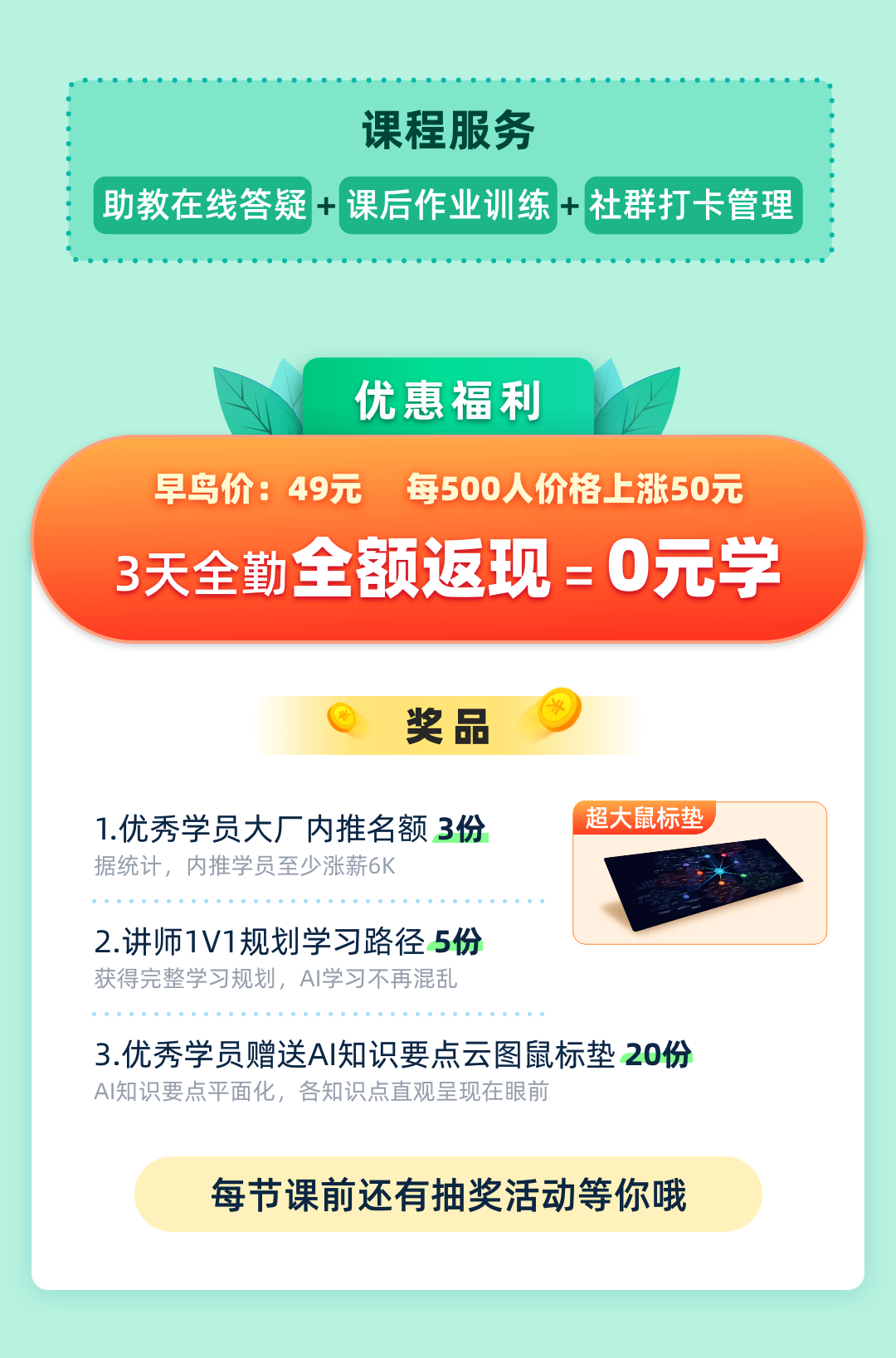 你只需支付 49元 的预定金,然后做到 3 天课程全勤 , 49 元预定金会在结课后 7 个工作日内全部退给大家。这些标准其实并不难,如果你态度认真,很轻松就能做到。