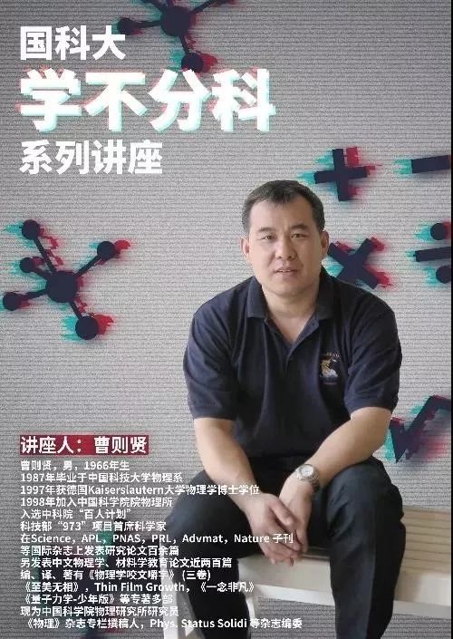 本期主讲人:曹则贤, 1987年毕业于中国科技大学物理系,1997年获德国Kaiserslautern大学物理学博士学位, 1998年加入中国科学院物理所;入选中科院“百人计划”,科技部“973”项目首席科学家,在Science,APL, PNAS, PRL, Advmat, Nature 子刊等国际杂志上发表研究论文百余篇,另发表中文物理学、材料学教育论文近两百篇,编、译、著有《物理学咬文嚼字》 (三卷),《至美无相》,Thin Film Growth,《一念非凡》,《量子力学-少年版》等专著多部。现为中国科学院物理研究所研究员, 《物理》杂志专栏撰稿人,Phys. Status Solidi等杂志编委。