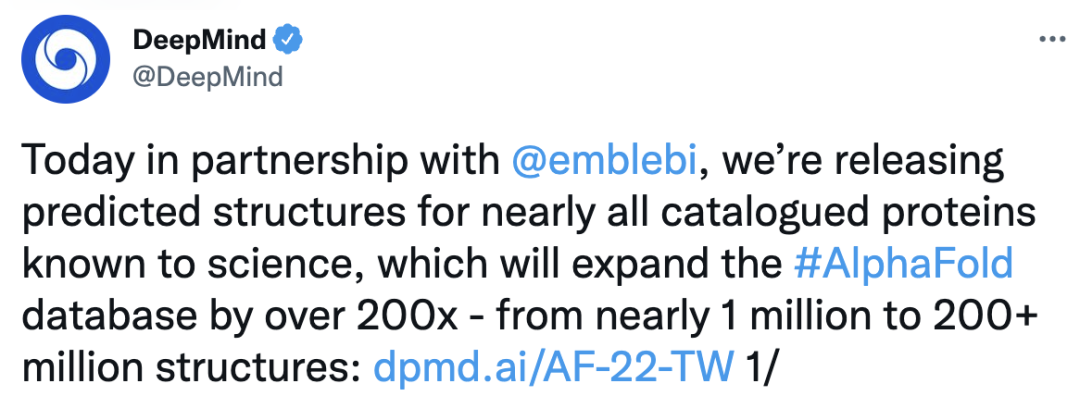 2022年7月28日,DeepMind将AlphaFold蛋白质结构数据库从近100万个结构扩展到超过2亿个结构。