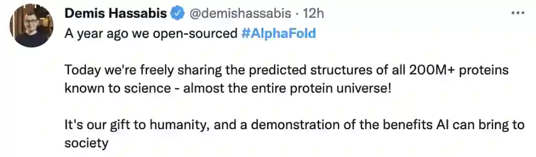 DeepMind的首席执行官Demis Hassabis表示:一年前,他们开源了AlphaFold。现在,他们分享了科学界已知的2亿多种蛋白质预测结构。