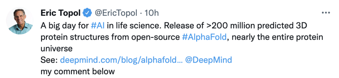 这位号称美医学界「世纪医生」的Eric Topol,对这个「里程碑」表示赞许:这是AI在生命科学领域的「大日子」,超过2亿个预测的3D蛋白质结构,几乎囊括了整个蛋白质宇宙!