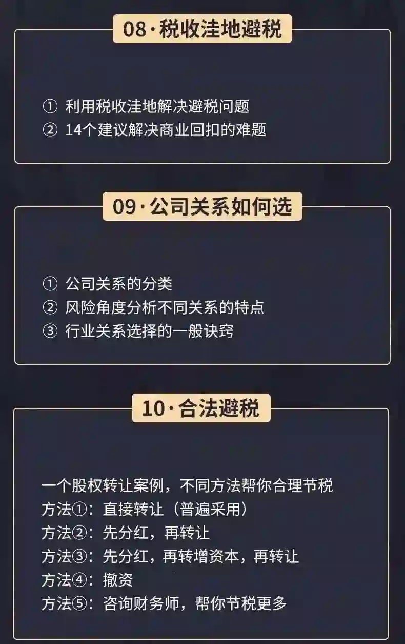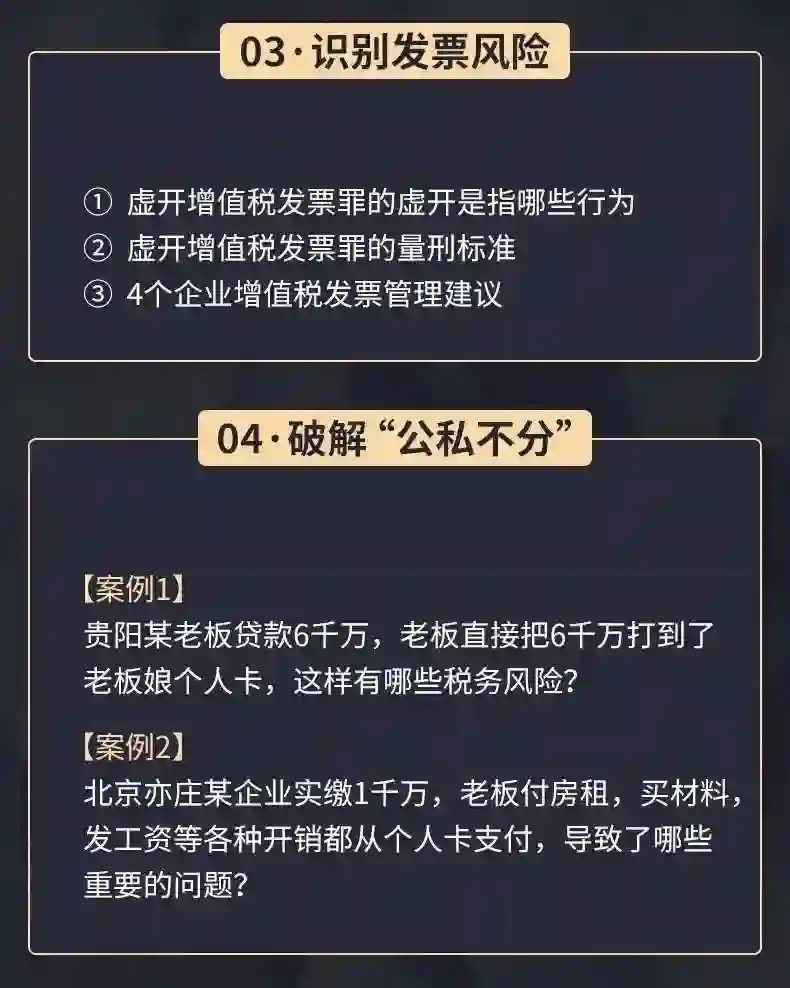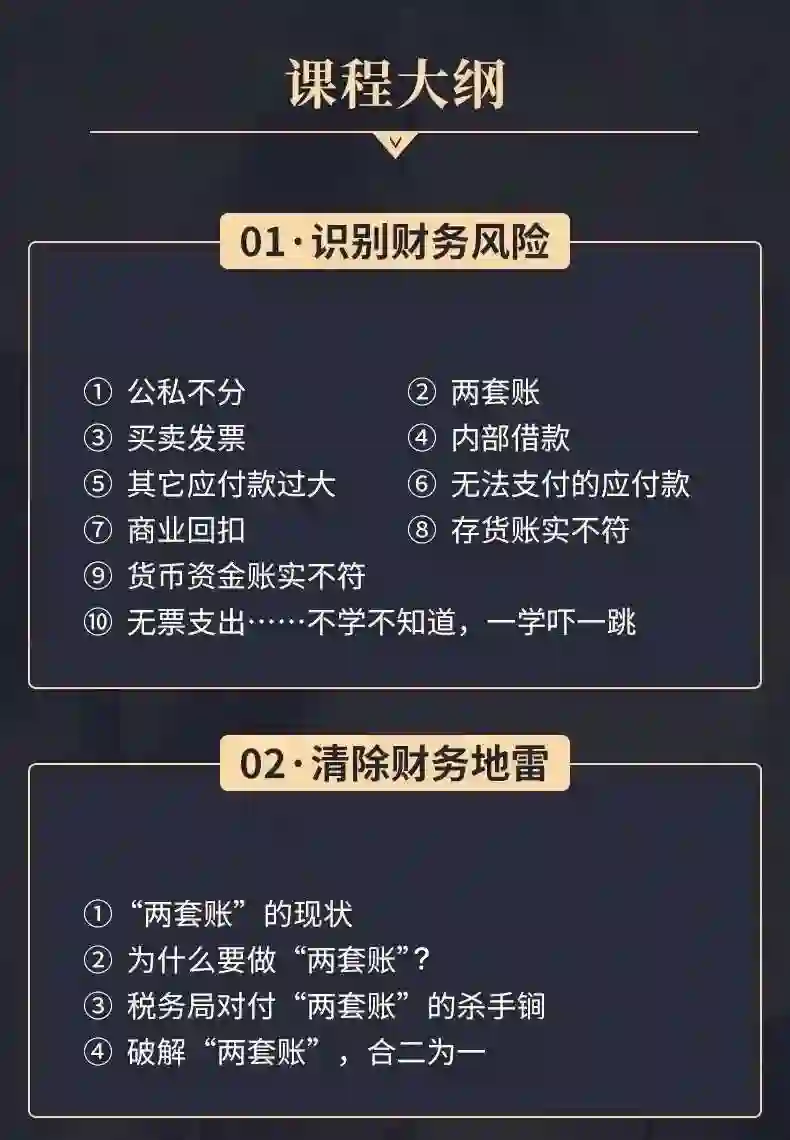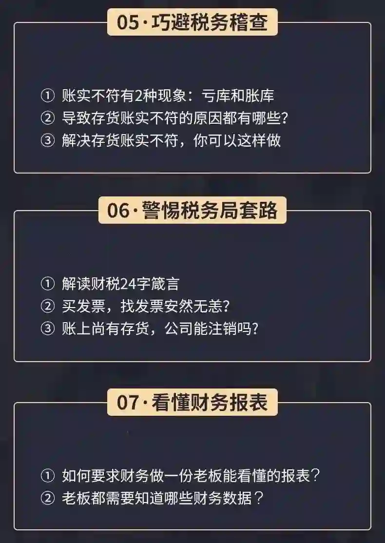 从原罪梳理、财税问题、节税避税、资金管理四大板块出发,让你识别公司容易触发的财务风险,看懂财务报表,合理避税,提高资金的利用效率。