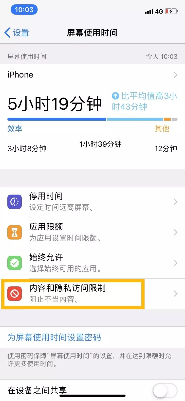iOS 12 系统的机友看好了,点开“设置→屏幕使用时间→内容和隐私访问限制”。