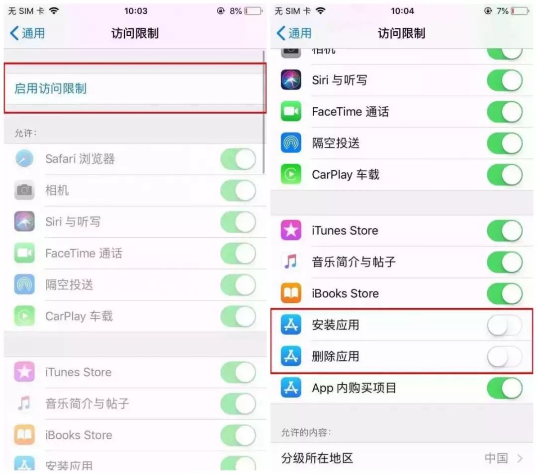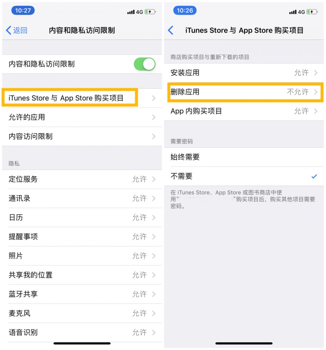进入“ iTunes Store 与 App Store 购买项目”,把“删除应用”改成不允许就 ok 了。