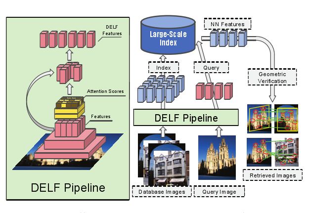 我们提出了一个非常适合大规模图像检索的局部特征描述子,称作DELF(DEep Local Feature)。这个新的描述子是基于卷积神经网络的,并在只有图像级注释的路标数据集上进行训练。该图像检索方法的架构如下图所示: