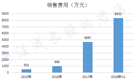 销售费用成倍增长,2017年开始暴增,2018年上半年销售费用高达8321万元,同比增长10倍。