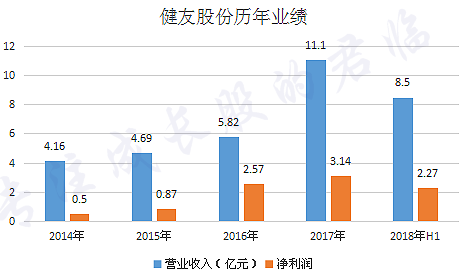 从2016年开始,健友营收和净利润都开始爆发式增长,2018年上半年营业收入8.5亿元,同比增长75.65%,净利润2.27亿元,同比增长84.24%。