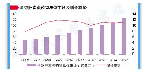 2015年,全球肝素市场规模已达到125.8亿美元,2006年-2015年GAGR约为11%,发展前景广阔。