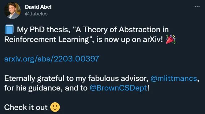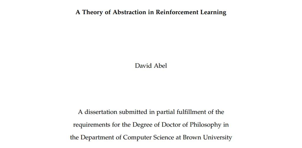 在前段时间结束的第36 届 AAAI 人工智能会议上,大会官方公布了新一届的 AAAI/ACM SIGAI 博士论文奖,其中一篇专门分析强化学习抽象理论的论文《A Theory of Abstraction in Reinforcement Learning》获得了该奖项提名。论文作者David Abel 博士毕业于布朗大学,他于近日将这篇博士论文上传到了arXiv上,共有295页。