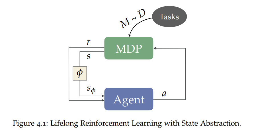 在第4章中,作者将此分析扩展到终身性强化学习,其中智能体必须不断与不同的任务进行互动并解决不同的任务。本章主要是对终身学习环境下的PAC状态抽象的洞察,并阐明如何有效计算它们的结果。定理4.4阐明了保证这些抽象保持良好行为的意义,定理4.5说明了要多少以前解决的任务才能计算出PAC状态抽象。作者重点介绍了模拟实验的结果,这些结果说明了引入的状态抽象类型在加速学习和规划方面的效用。