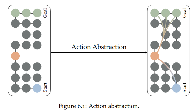 在第6章中,作者介绍了Jinnai等人的相关工作,它研究了如何找到使规划尽可能快的抽象动作的问题。结果表明,这个问题基本是NP难问题,甚至很难在多项式时间内近似。