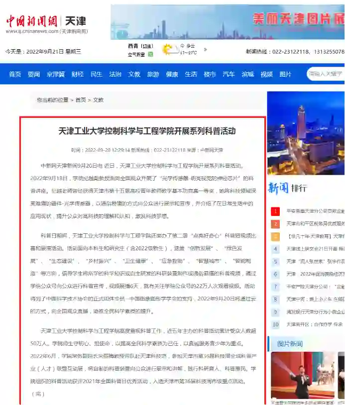 2022年9月20日,“点亮好奇心”科普短视频展演活动通过蔻享学术平台进行直播,天津工业大学控制科学与工程学院常务副院长宋丽梅教授致辞,活动旨在营造爱科学、学科学、传播科学的网络环境,带动广大公众参与线上科普活动。活动面向本科生和研究生(含2022级新生),涵盖“创新发展”、“绿色发展”、“生态建设”、“乡村振兴”、“卫生健康”、“应急救助”、“智慧城市”、“智能制造”等方向,倡导学生将所学的科学知识或自主研发的科研装置制作成通俗易懂的科普视频,向全国观众进行讲解和宣传,首日播放量8万次,累计播放30多万次。