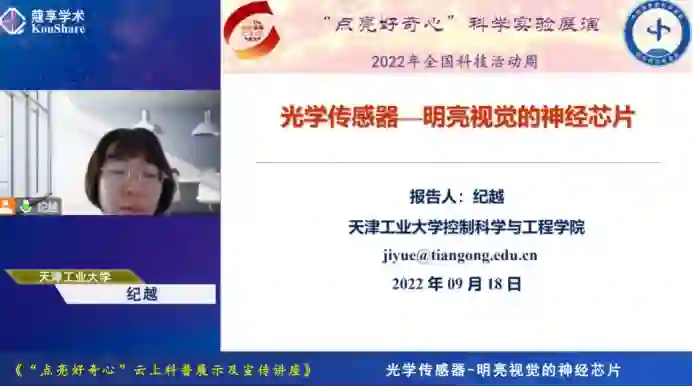 2022年9月18日,天津工业大学控制科学与工程学院纪越副教授面向全国观众开展了“光学传感器-明亮视觉的神经芯片”的科普讲座。纪越老师曾经获得天津市第十五届高校青年教师教学基本功竞赛一等奖,她将科技领域深奥难懂的器件-光学传感器,以通俗易懂的方式向公众进行展示和宣传,并介绍了在日常生活中的应用现状,提升公众对高科技的理解和认知,激发科技梦想。
