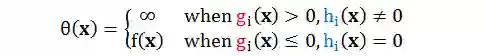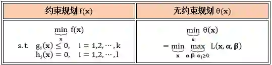 因此无约束最小化 θ(x) 等价于有约束最小化 f(x) 的确是等价的,数学表达形式的对比在下表
