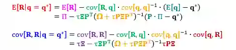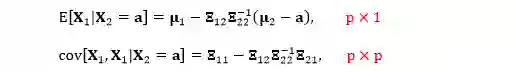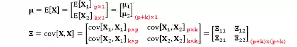 假设列向量 X 被分解成 p 维列向量 X1 和 k 维列向量 X2,即 X = [X1;X2],如果 X1 和 X1|X2 都服从正态分布,那么 X 也服从正态分布;反之如果 X 服从正态分布,其均值和协方差表示如下,