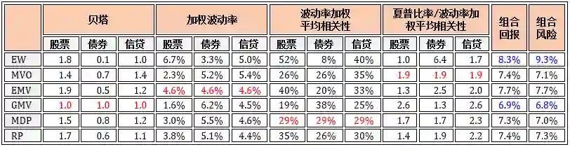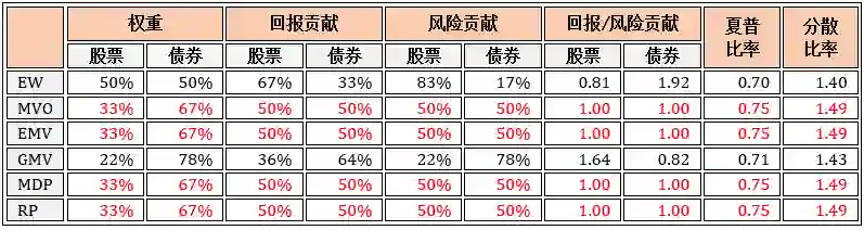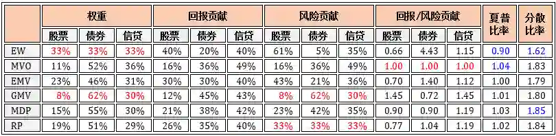 MVO 夏普比率最高 (独有性质),各资产的“回报贡献和风险贡献比值”相等 (最大夏普比率的条件),此外“夏普比率和波动率各资产的加权平均相关性的比值”相等。
