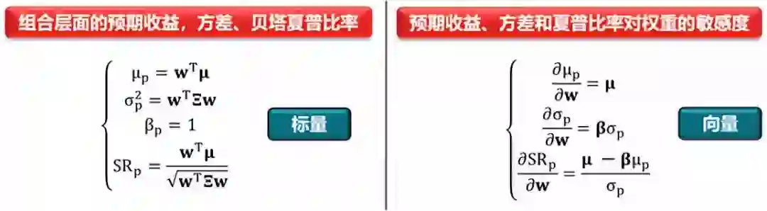 在组合管理时,通常我们把组合层面的预期回报和方差用每个资产的权重表示出来,最常见是求它们 (标量) 对权重 (向量) 的偏导数。