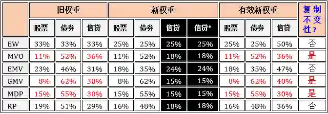 注意:信贷* 和信贷的复制品,显然它们被分配的权重应该一样。结合两者就得到有效新权重下的信贷权重。以 MVO 举例,18%+18% = 36%。