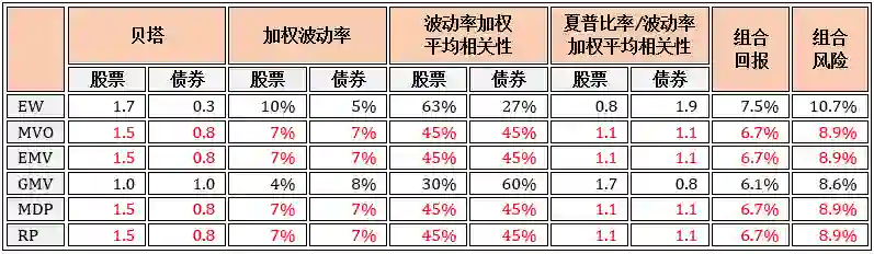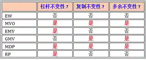 从上表可知,MVO, GMV 和 MDP 具有“复制不变性”,而 EW, EMV 和 RP 不具有。