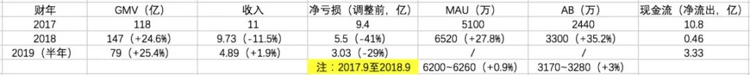 蘑菇街2017财年至2019财年上半年GMV、收入、净亏损、MAU、AB、现金流等数据概况,36氪根据招股书整理
