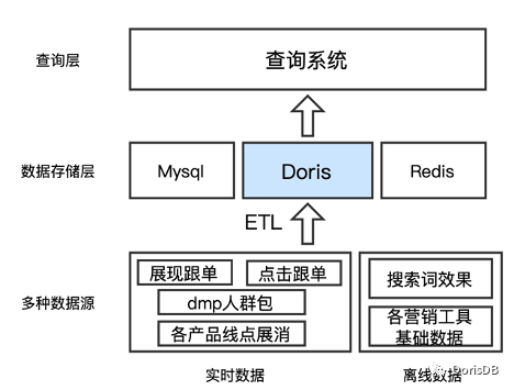 经过对我们系统的改造,目前我们使用Doris作为我们系统中的一个数据存储层,汇总了离线和实时数据,也为上层查询系统提供统一的效果数据查询接口。如下图所示: