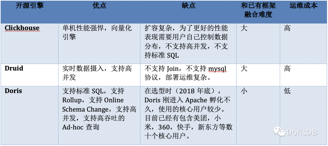 目前开源的OLAP引擎很多,但由于面临大促的压力,我们需要尽快完成选型并进行数据迁移,因此我们只考察了比较出名的几个OLAP系统:ClickHouse,Druid和Doris。最终我们选择了Doris来替换我们的原有系统,主要基于以下几方面的考虑: