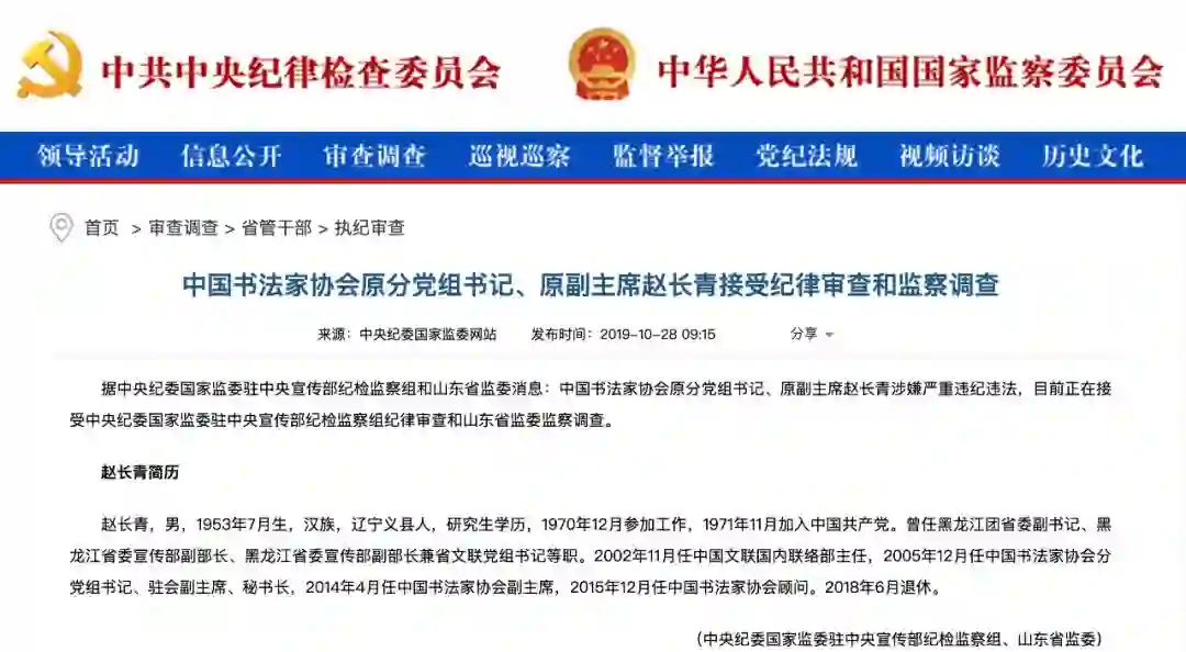 据中央纪委国家监委驻中央宣传部纪检监察组和山东省监委10月28日消息:中国书法家协会原分党组书记、原副主席赵长青涉嫌严重违纪违法,目前正在接受中央纪委国家监委驻中央宣传部纪检监察组纪律审查和山东省监委监察调查。