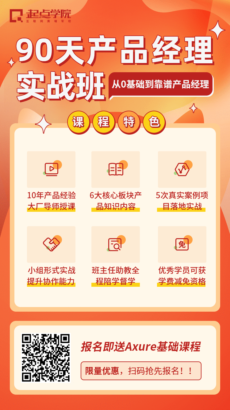 在这里,向大家推荐起点学院联合腾讯课堂创办的产品入门课程「90天产品经理实战班」,可以帮助你系统学习产品知识核心板块,在大厂导师的带领下打磨出一整套规范产品作品集,实打实提升自己的职场竞争力!