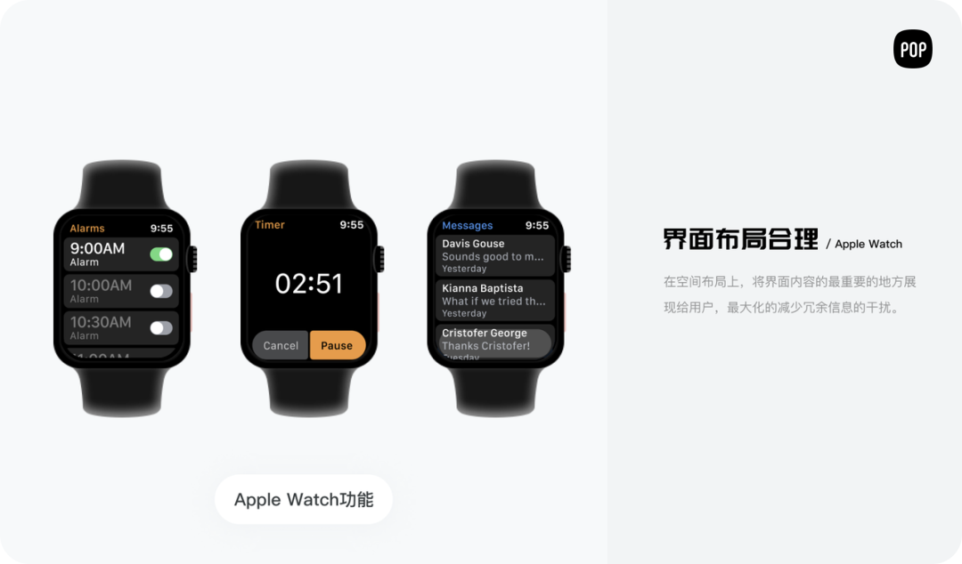 Apple Watch 上的操作简单快捷,不像手机、电脑等复杂的操作方式,需要针对目标用户的需求进行一定的精简和优化。它需要帮助用户做好选择,而不是给用户更多的选项去选择。