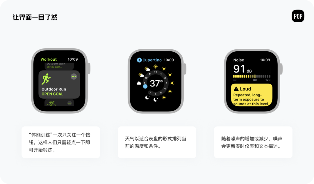 手表的使用场景大多都是运动、工作、学习,所以动态场景下,手表的界面就变得简洁易读。