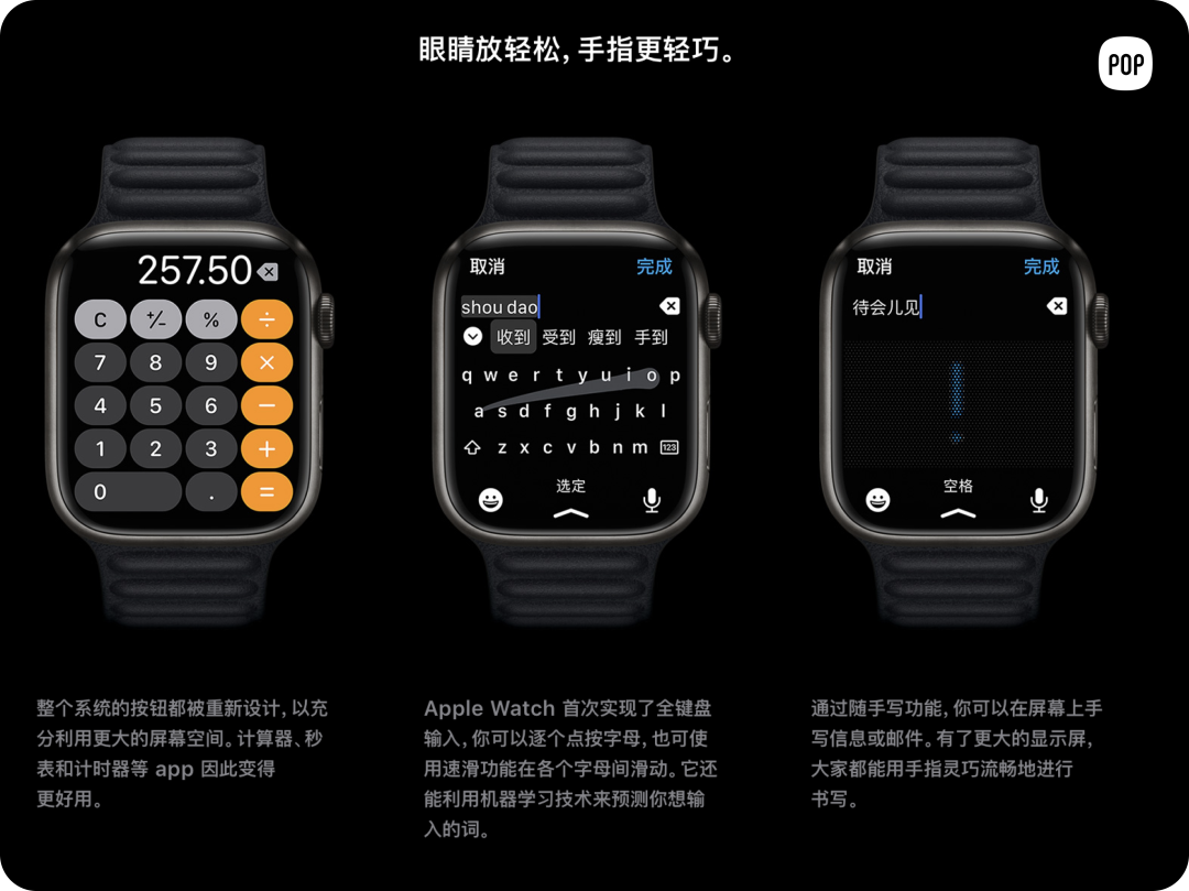Apple Watch 上的交互操作简单快捷,不像手机、电脑等复杂的操作方式。抬起手机可以查看最新收到的信息、戴着口罩可以面部解锁、放下手腕就能熄屏。