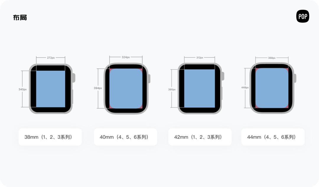 Apple Watch 有四种尺寸——38mm、40mm、42mm、44mm,其中40mm、44mm的是比较新的设备规格。小屏幕尺寸是340×272像素,大屏幕是390×312像素(核心设计尺寸)。