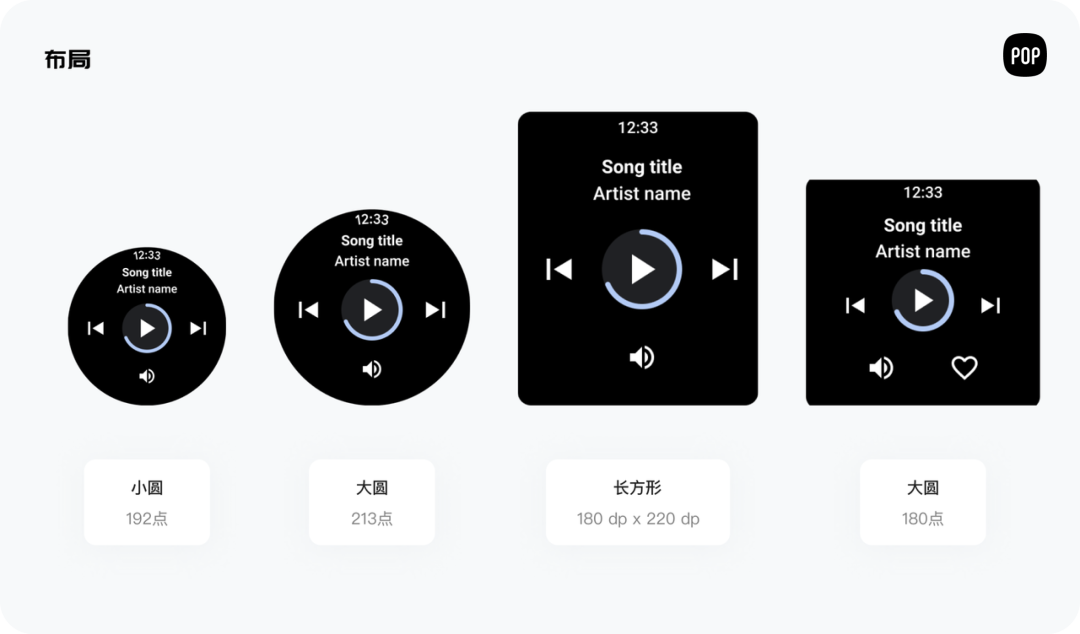 大圆(213点):对于大型圆形布局,Wear OS 可以提供对任何尺寸的替代